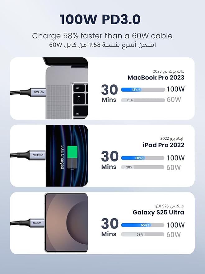 - Includes UGREEN 1M USB-C to USB-C braided cable with 100W PD fast charging.